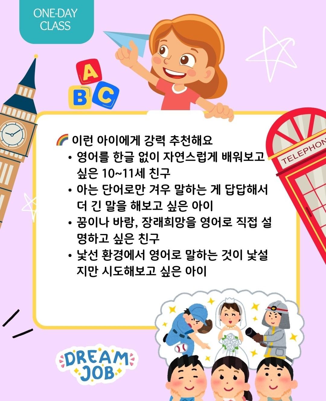 아이의 상상력과 영어 표현 능력을 훨씬 더 풍부하게 도와주는 "내 꿈을 영어로 말해요!" 수업입니다. 100% 영어로 진행되는 수업이라 말하기 실력 뿐 아니라 듣고 이해하는 능력도 키워주는 데 도움이 되는 수업입니다. 간단한 영어 문장을 읽을 수 있다면 참여 가능해요!