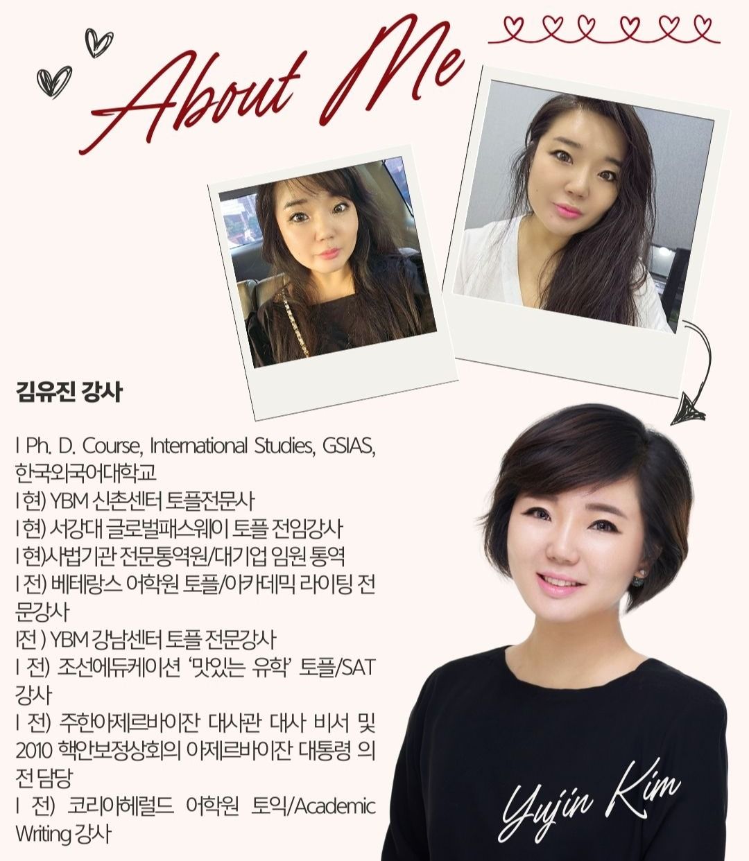 "영어는 영어 전문강사에게 배우세요!" 안녕하세요! 영어전문 강사 유진쌤입니다! 전 18년 이상 영어강사, 전문 통번역가 및 해외 업무에 종사한 경험으로, 현재 신촌 YBM과 서강대 Global Passway에서 토플을 가르치고 있습니다. 또한, 국내외 국제학교 학생들을 대상으로 TOEFL, academic writing 및 interview 수업을 하고 있습니다. 호주 교포 출신이며 영어를 전공했고 한국외국어대학교 GSIAS에서 북미정치학 석사를 졸업했고 현재 동대학원에서 박사과정에 있습니다. 주한 아제르바이잔대사관 대사 비서, 대기업 임원 통역 및 해외 방송 사업관련 업무 역임, 전문 기업 통번역사, 사법통역사 및 YBM어학원/전국대학교/조선 에듀케이션/코리아헤럴드 등에서 토익/토플 전문강사로 일했습니다. 탄탄한 영어 지식과 경험으로 학생들의 실력에 맞는 최적화 된 수업을 구상하고 국제화 사회에서 성공할 수 있는 영어 인재로 키우고 싶으시죠? 아이들이 영어를 싫어하나요? 지겹고 귀찮은 영어 수업이 아니라 학생들이 직접 참여하고 적극적으로 활용할 수 있는 영어 수업으로 다가가겠습니다!