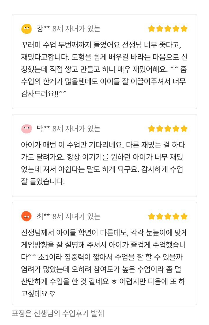 안녕하세요. 꾸그 친구들 :) 저는 보드게임 전문강사 표정은입니다. 보드게임은 문제해결력을 높이고, 전략적 사고를 할 수 있도록 도와주고 저는 아이들이 보드게임을 재밌게도 하지만 학습적으로 도움을 받을수 있도록 교육하고 있습니다. 아이들에게 보드게임으로 스스로 생각할 수 있는 힘을 키워서 문제해결력을 높일 수 있도록 도와주겠습니다. 한가지 게임으로도 쉽게, 어렵게, 재미있게 다양하게 즐길 수 있는 보드게임세상으로 놀러오실래요?