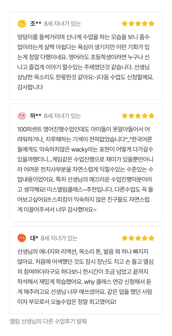 안녕하세요. 초등영어교육 전문가 최엘림입니다! 저는 미국 국제학교에서 초등학교 담임을 맡으면서 영어뿐 아니라 과학, 사회, 수학 등 전과목을 외국 아이들에게 영어로 가르쳤습니다. 또한 한국 국제학교에서도 담임을 맡아 수업을 진행하며 한국 아이들도 많이 만나보았어요. 수년간 다양한 문화권, 다양한 연령대의 초등학생을 대상으로 ‘영어’로 여러 과목을 가르치면서, 모든 아이들은 언어를 배우는 본능이 뛰어나고, 영어를 ‘언어’로 재미있게 배울 수 있는 능력이 있다는것을 지켜봐왔습니다. 암기식, 문법식 한국교육을 털털 털어버리고, 저와 함께 영어를 영어로 배워보실 준비 되셨나요? :)