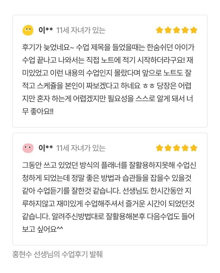'분명 플래너가 좋은 건 아는데 왜 꾸준히 쓰지 못할까? 난 의지가 약한 걸까?' 아니요. 절대 아닙니다. 플래너 전문가 홍현수 작가! 단호하게 말씀드리겠습니다. '여러분은 문제없습니다. 다만, 제대로 된 방법을 못 배웠을 뿐입니다.' 우리는 국, 영, 수 선생님은 많이 만났지만, 플래너 선생님은 본 적이 없습니다. 플래너를 잘 활용하면 시간관리부터 학습, 공부의욕에 큰 도움을 받을 것 같은데 막상 쓰려고 하면 3일 이상 꾸준히 쓰기가 어렵습니다. 결국 어느 샌가 구석에 박힌 플래너를 볼 때가 많았죠. '플래너 쓰는 방법이 모두 같을 필요는 없잖아? 다양한 사람만큼 플래너도 다양하게 쓰는 방법이 있는 게 아닐까?' 이것이 고민의 시작이었습니다. 제 강의들은 플래너를 통해 아이들을 관찰하고, 맞춤방법을 제안하여, '자기주도적 습관'을 키워 주는 것이 목적입니다. 그리고 그것이 반드시 학습에만 국한되진 않습니다. 무엇이든 자기 주도적 습관만 갖춘다면 일가를 이룰 수 있기 때문이죠. 그래서 '공부만 잘하는 아이'보단 '공부도 잘 하는 아이'를 지향합니다. 최근 아이를 더 체계적으로 관찰하기 위해 MBTI와 에니어그램 검사자격을 취득했고요 전문성을 더 높이고자 '한국교원대학교 대학원'에 진학 석사학위 취득 후 박사과정 중입니다. 플래너는 플래너를 쓸 줄 아는 사람에게 배워야 합니다. 단순히 시간이 표시된 양식지에 쓴다고 술술 써지지 않거든요. 많은 시행착오와 자신에 대한 고민, 달성하지 못한 계획의 원인과 개선을 끊임 없이 고민하는 가운데 서서히 향상되는 게 플래닝 능력입니다. 그래서 습관화가 관건이었습니다. '잘 쓰냐, 이쁘게 쓰냐'가 중요한 게 아니라 '썼냐, 안 썼냐'가 훨씬 중요하더라고요. 아이와 함께 하는 코치의 자세로서, 열정과 진심을 다해 지도하겠습니다.