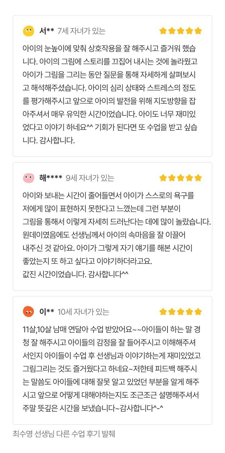 안녕하세요. 15년차 아동 전문 심리 상담사 " 아이들의 비밀친구" 최수영선생님 입니다. 아이들을 중점적으로 만나다 보니 어린 시절 일기장에 소소한 이야기를 하듯 비밀일기와 교환일기 쓰듯 저도 아이들이 편안하고 재미있는 선생님으로 아이들이 자신의 시시콜콜한 사소한 이야기 뿐아니라 마음속 비밀을 이야기 할 수 있는 친구 같은 존재가 되어주고 싶어 " 아이들의 비밀친구" 라는 타이틀을 사용하고 있습니다. 15년 동안 많은 아이들을 대상으로 복지관, 발달센터, 영재교육원, 유치원, 초등학교 방과후 강의등 를 통해 다양한 대상의 경험을 하다보니 대부분의 아이들이 스스로 자신의 감정을 표현하는 것이 서툴며 학습에 치우치다 보니 자신의 속마음을 표현할 기회가 많이 없다는 것을 느꼇습니다. 심리상담은 진단을 받거나 정말 문제가 있어 받는 것이 아닌 누구나 자신의 생각과 마음을 표현할 수있는 쉽게 다가갈수 있는 가볍게 경험 할수있는 시간이 되었으면 좋겠다 생각과, 해외거주하는 아이들도, 지방에 사는 아이들도 다양한 시간에 편하게 언어로 표현하는 것보다 그림이라는 매체를 통해 그림을 그리면서 자신의 마음을 표현하고 저와의 대화를 통해 자신의 가치와 행복을 알았으면 좋겠다는 생각이 들어 "꾸그"를 통해 온라인 수업을 진행하게 되었습니다. 온라인 심리상담은 언어표현이 힘든 유아부터 사춘기 아이들까지 그림을 그리면서 자유롭게 이야기를 하고 자신의 생각과 감정을 발산하는 시간을 가질 수있으며. 엄마, 아빠에게 표현하기 어려운 속마음, 마음속 고민을 이야기 할 수 있는 시간 입니다. 아이가 자신그리고 가족을 어떻게 생각하는지 . 학교생활은 어떤지 . 자신의 감정을 표현하지 않아 답답하고 속마음을 모르겠다면. 저와의 시간을 통해 아이에게 필요한 솔루션을 받아보세요. 그동안 예술/미술 치료사로서 다양한 아이들을 만나왔으며, 500건 이상의 온라인 그림검사를 통해 온라인에서도 전문적으로 아이들의 마음을 체크할수있는 시간 꾸그를 통해 아이들이 스스로 자신을 사랑하고 자신 속마음을 표현할수 있는 공간이 될수 있도록 최선을 다해 아이들의 이야기에 귀기울이며 아이들 한명하면 사랑스러운 눈으로 아이의 행복을 발견하도록 노력하겠습니다 :)