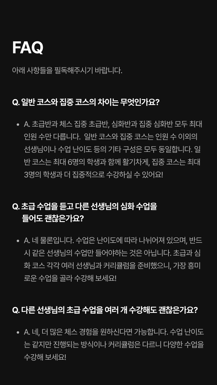 4:1로 진행하는 체스 정규 클래스 입니다. 초급반에서 배운 내용을 바탕으로 심화 과정을 익혀 체스를 마스터해요!