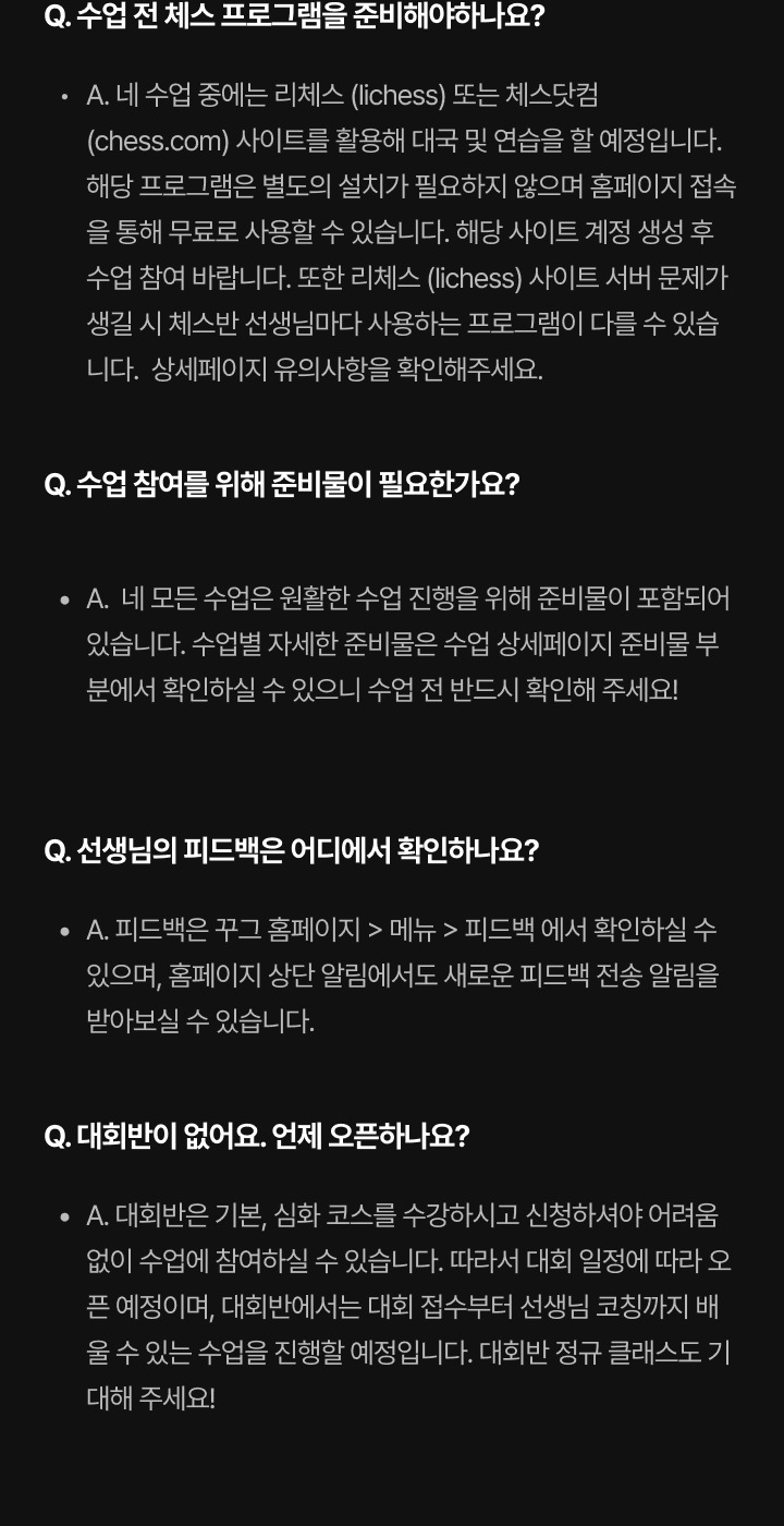 수업 중 체스닷컴을 활용해 대국 및 연습을 할 예정입니다. 수업 전 해당 사이트 계정을 미리 가입해 주세요. (예복습용으로 필수는 아님) 해당 프로그램은 별도의 설치가 필요하지 않으며, 홈페이지 접속을 통해 무료로 사용할 수 있습니다. 체스닷컴 사이트 주소 : chess.com/ko