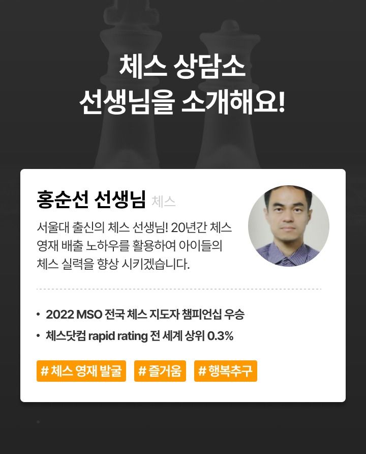 저는 지난 20년간 바둑, 체스 영재들을 많이 배출했는데, 많은 지도경험과 노하우를 활용하여 체스의 빠른 실력향상을 보장합니다. 앞으로 전국 최고의 체스 영재들을 발굴하려고 하는데, 무엇보다도 교육의 가장 큰 목표는 개인의 능력계발과, 사고(思考)의 즐거움을 통한 행복추구입니다