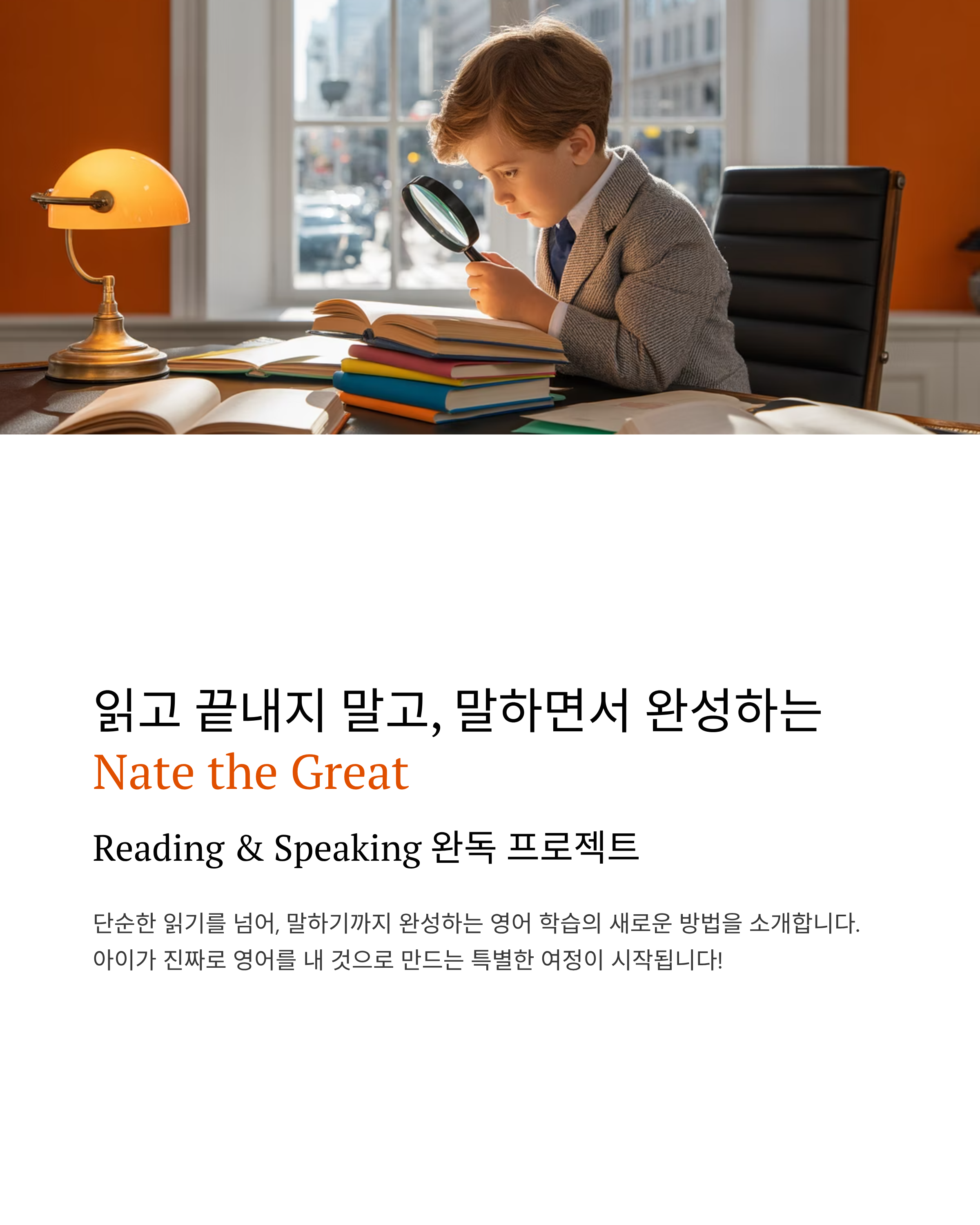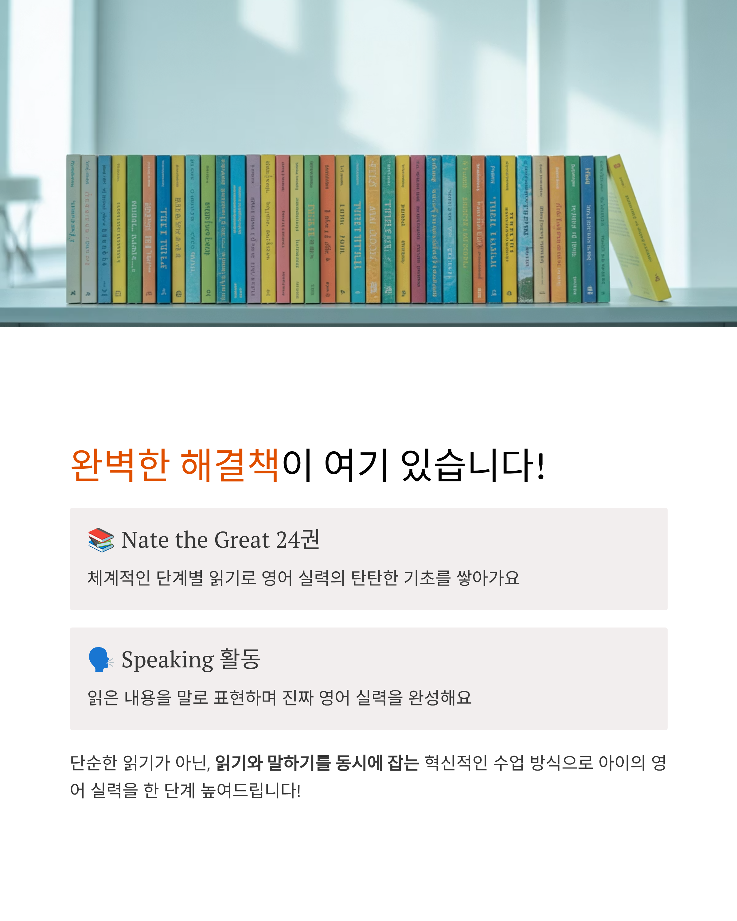 영어 원서 『Nate the Great』 시리즈 24권을 차근차근 완독하면서, 단순한 독서 훈련을 넘어 말하기 자신감을 길러주는 특별한 수업입니다.
