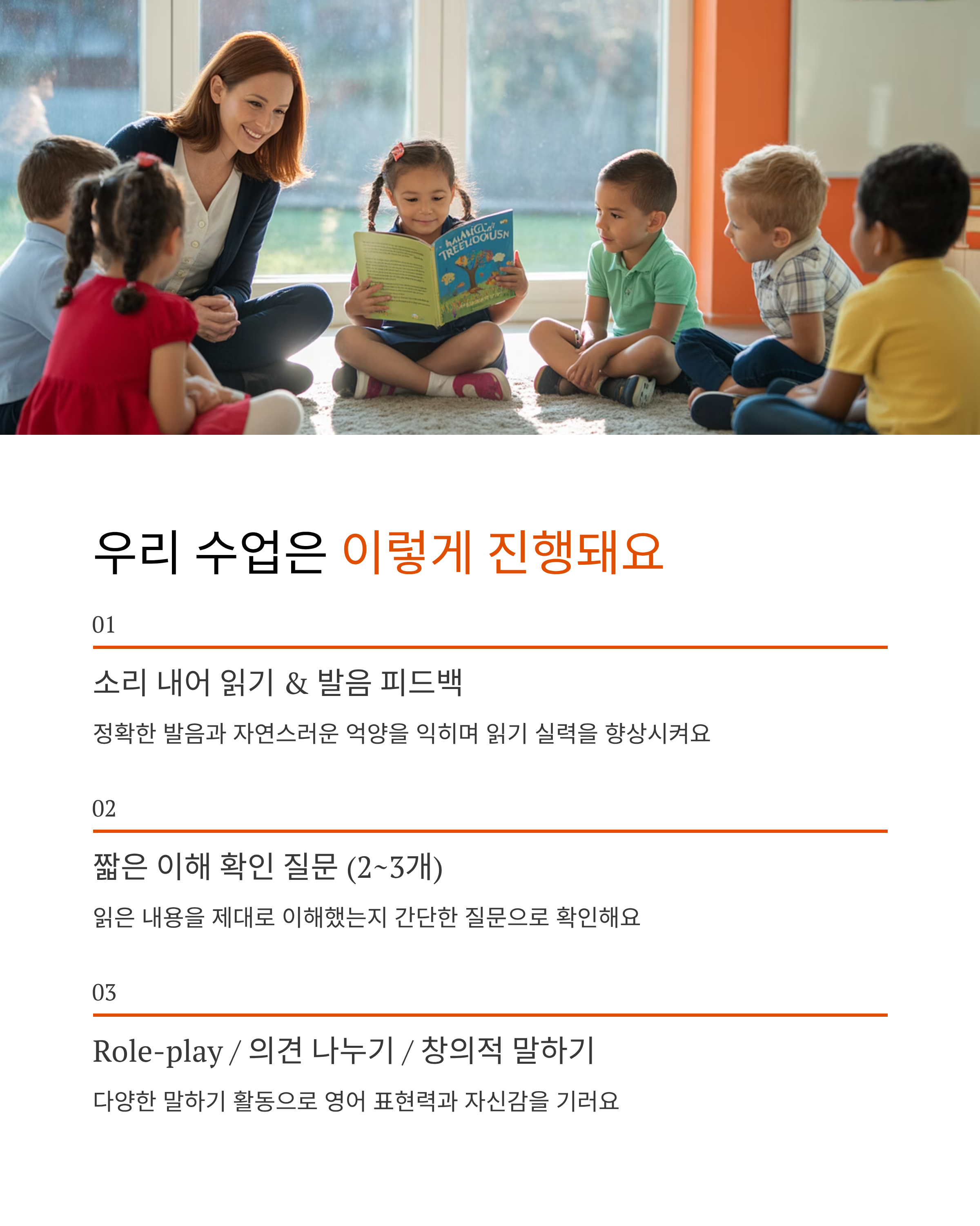 아이들은 매 시간 책을 소리 내어 읽고, 이해한 내용을 간단히 확인한 뒤, Role-play·의견 말하기·자기 경험 나누기 등 다양한 Speaking 활동으로 표현력을 키워갑니다.