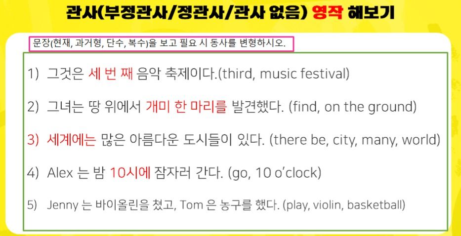 35개 문제 풀이와 영작을 하고, 관사&전치사