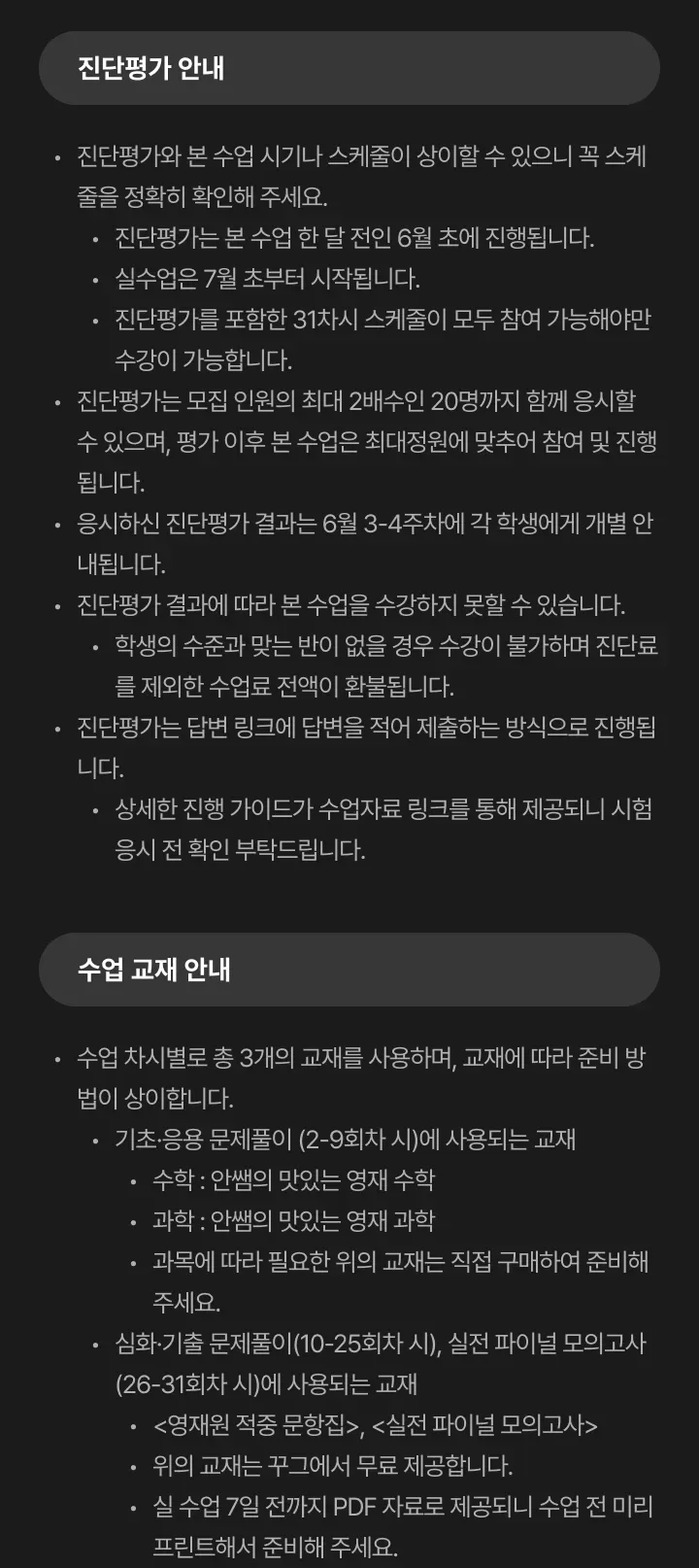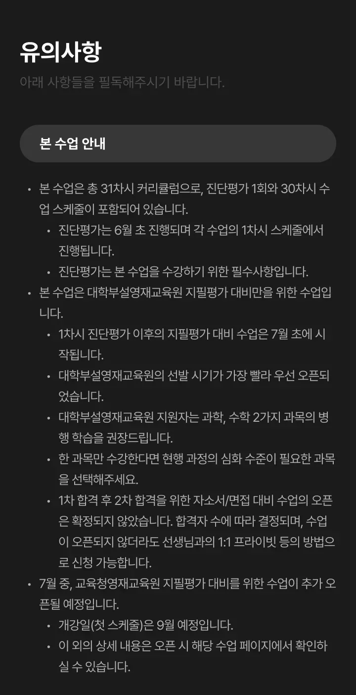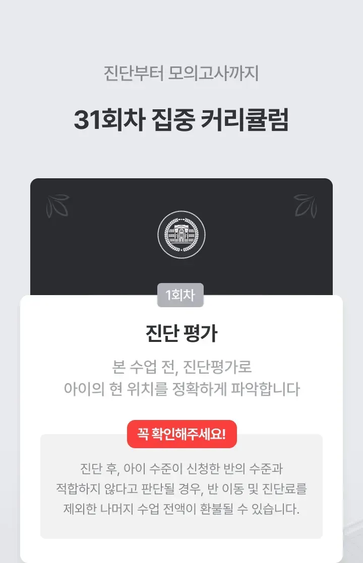진단평가와 본 수업 시기의 스케줄이 상이할 수 있으니 꼭 스케줄을 정확히 확인해 주세요.