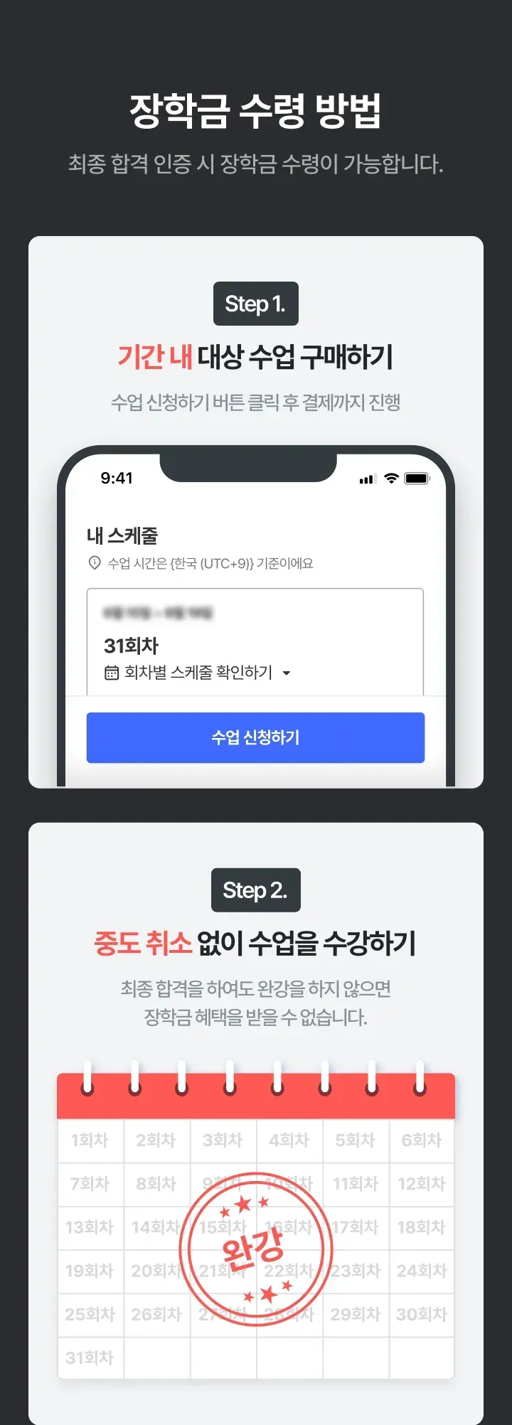 중도 취소없이 총 31차시의 수업 스케줄을 모두 수강해주셔야 합니다. 중도 취소한 학생은 시험에 합격해도 이벤트 대상자에서 제외됩니다.