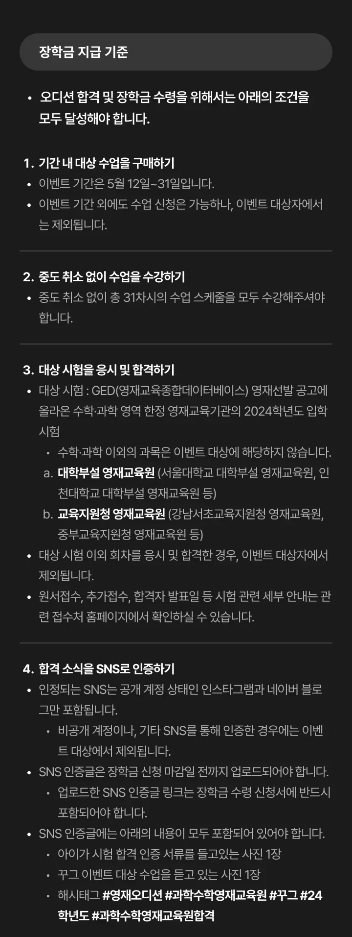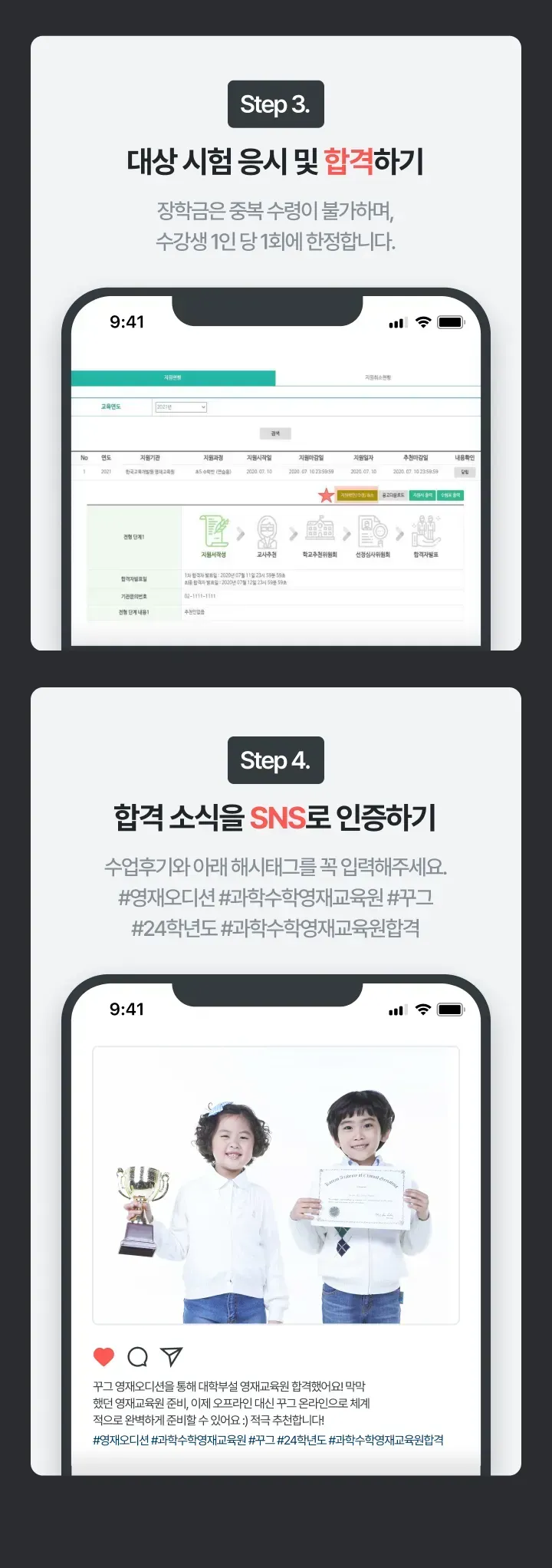 인정되는 SNS는 공개 계정 상태인 인스타그램과 네이버 블로그만 포함됩니다. 비공개 계정이나, 기타 SNS를 통해 인증한 경우에는 이벤트 대상에서 제외됩니다. SNS 인증글은 장학금 신청 마감일 전까지 업로드되어야 합니다. 업로드한 SNS 인증글 링크는 장학금 수령 신청서에 반드시 포함되어야 합니다. SNS 인증글에는 아래의 내용이 모두 포함되어 있어야 합니다. ((1) 아이가 시험 합격 인증 서류를 들고있는 사진 1장 (2) 꾸그 이벤트 대상 수업을 듣고 있는 사진 1장 (3) 해시태그 5건 모두 입력 '##영재오디션 #과학수학영재교육원 #꾸그 #24학년도 #과학수학영재교육원합격')