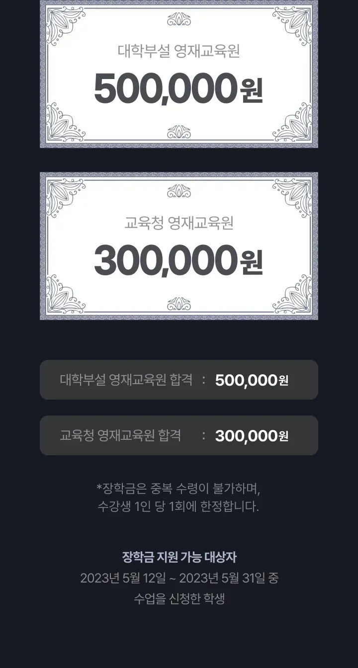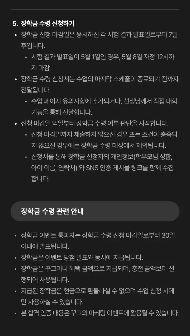 장학금 신청 마감일은 응시하신 각 시험 결과 발표일로부터 7일 후입니다. 시험 결과 발표일이 5월 1일인 경우, 5월 8일 자정 12시까지 마감. 장학금 수령 신청서는 수업의 마지막 스케줄이 종료되기 전까지 전달됩니다. 수업 페이지 유의사항에 추가되거나, 선생님께서 직접 대화 기능을 통해 전달합니다. 신청 마감일 익일부터 장학금 수령 여부 판단을 시작합니다. 신청 마감일까지 제출하지 않으신 경우 또는 조건이 충족되지 않으신 경우에는 장학금 수령 대상에서 제외됩니다. 신청서를 통해 장학금 신청자의 개인정보(학부모님 성함, 아이 이름, 연락처) 와 SNS 인증 게시물 링크를 함께 수집합니다.