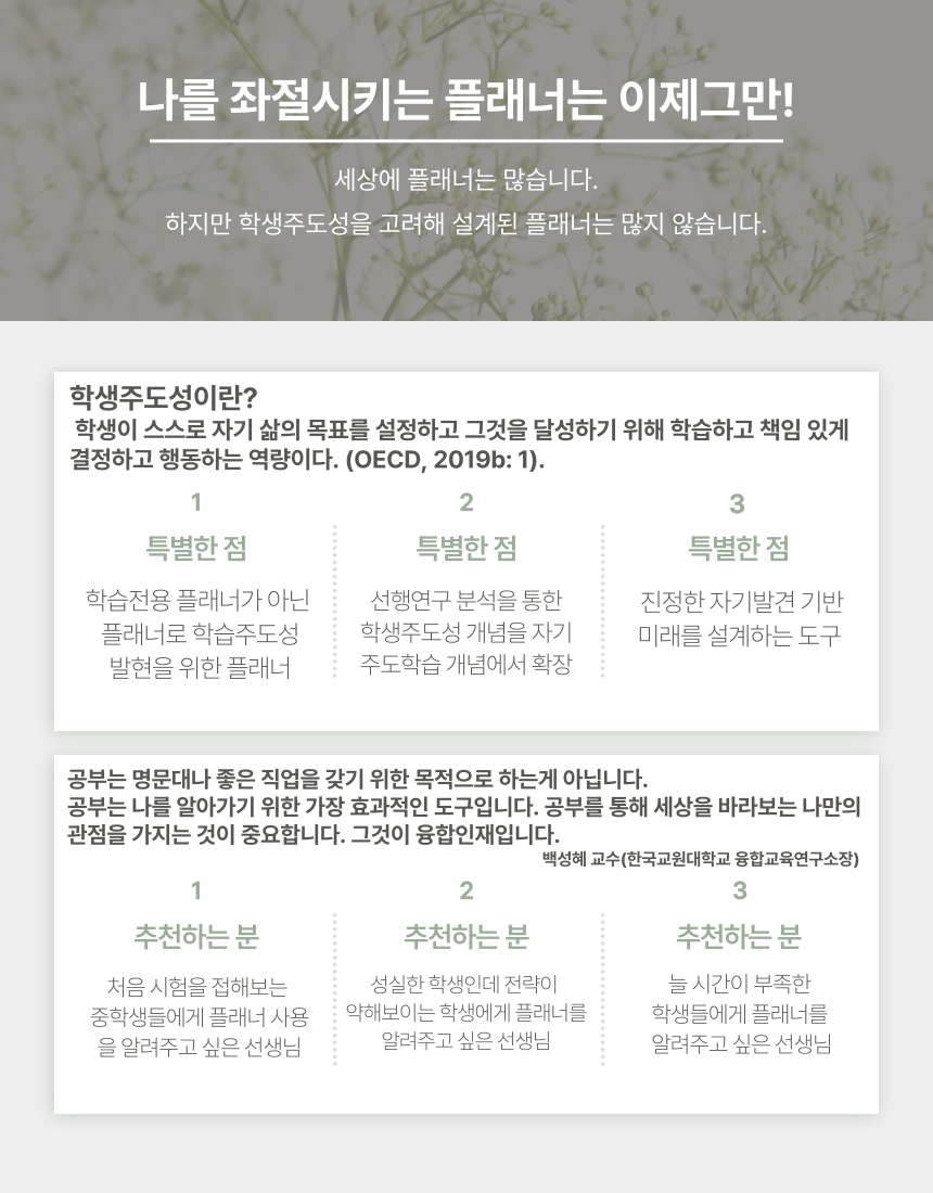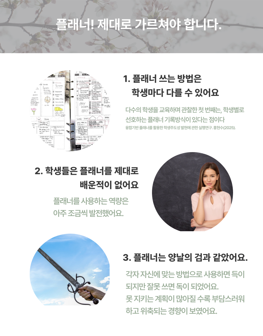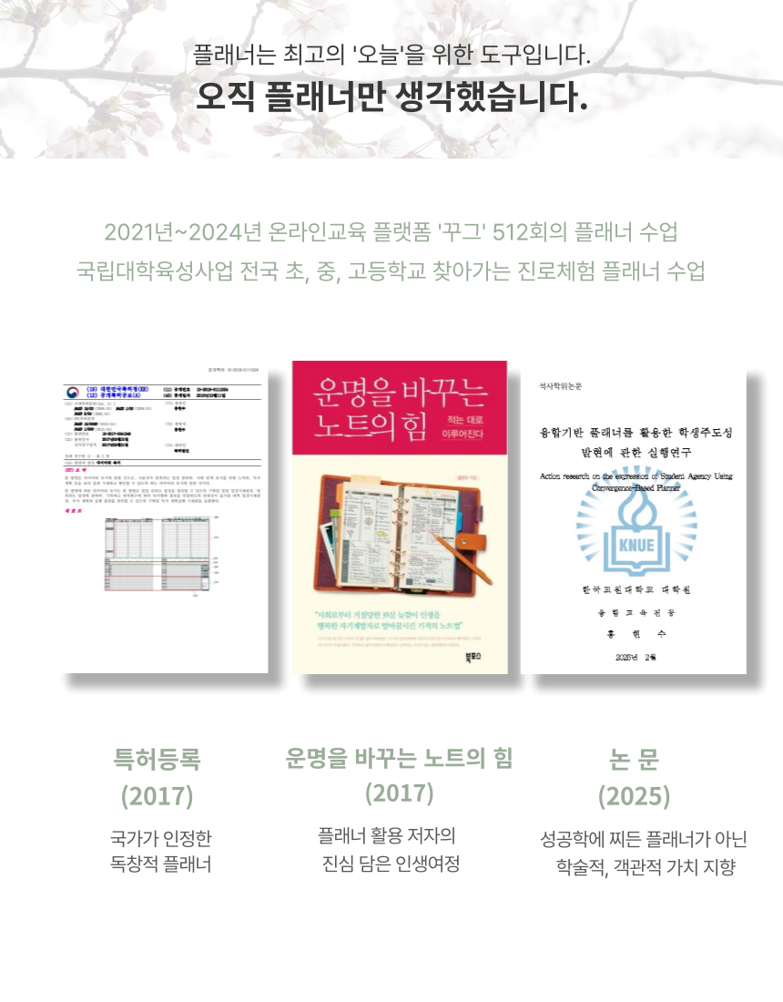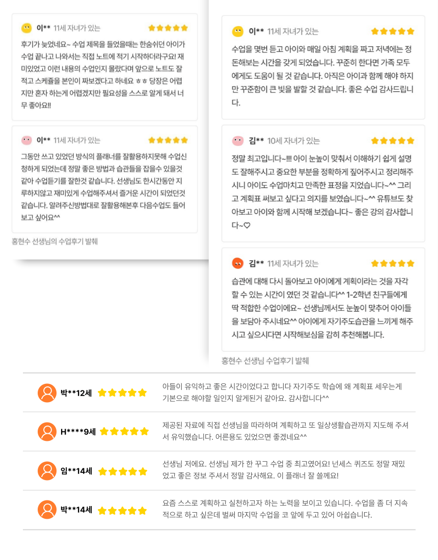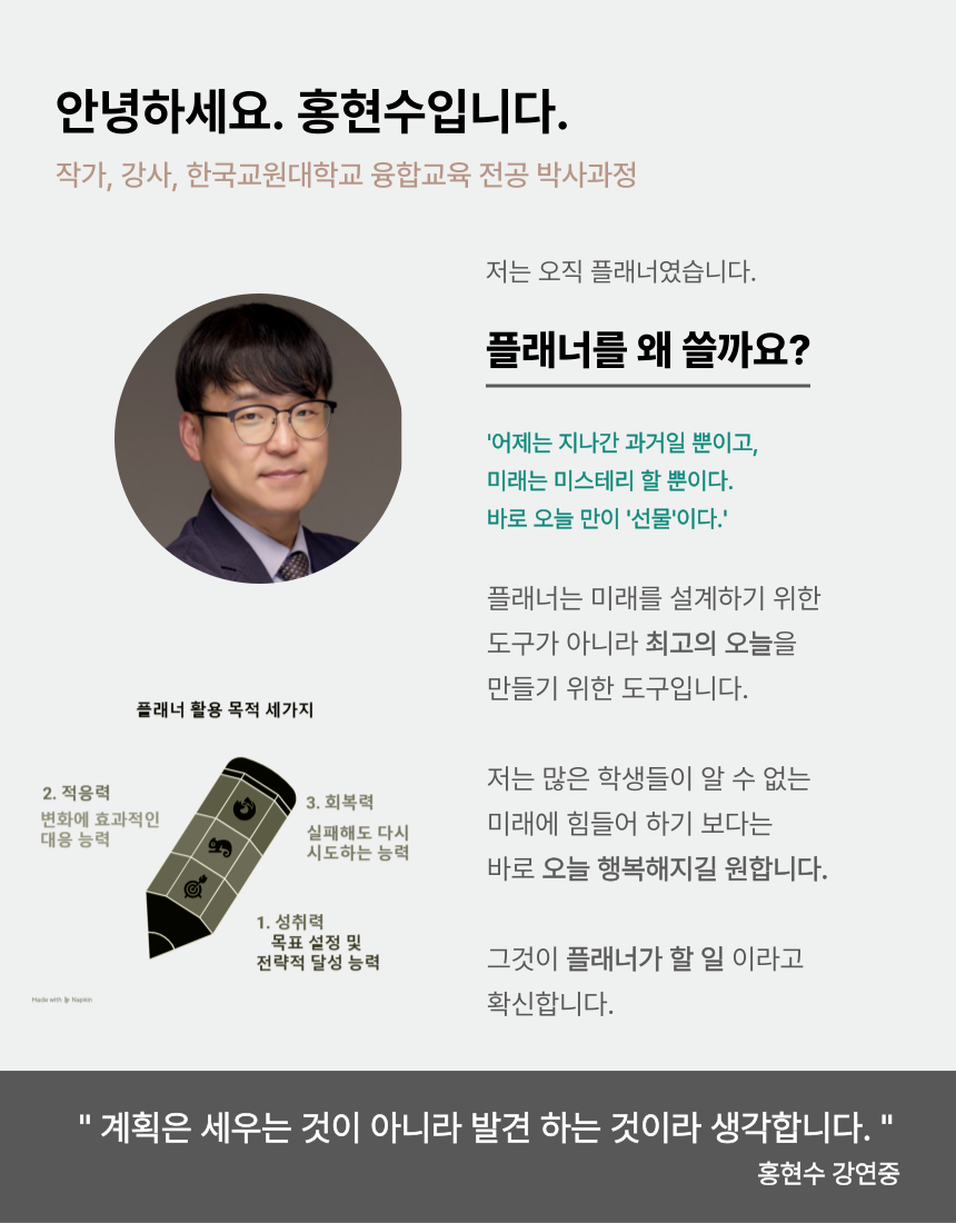 '분명 플래너가 좋은 건 아는데 왜 꾸준히 쓰지 못할까? 난 의지가 약한 걸까?' 아니요. 절대 아닙니다. 플래너 전문가 홍현수 작가! 단호하게 말씀드리겠습니다. '여러분은 문제없습니다. 다만, 제대로 된 방법을 못 배웠을 뿐입니다.' 우리는 국, 영, 수 선생님은 많이 만났지만, 플래너 선생님은 본 적이 없습니다. 플래너를 잘 활용하면 시간관리부터 학습, 공부의욕에 큰 도움을 받을 것 같은데 막상 쓰려고 하면 3일 이상 꾸준히 쓰기가 어렵습니다. 결국 어느 샌가 구석에 박힌 플래너를 볼 때가 많았죠. '플래너 쓰는 방법이 모두 같을 필요는 없잖아? 다양한 사람만큼 플래너도 다양하게 쓰는 방법이 있는 게 아닐까?' 이것이 고민의 시작이었습니다. 제 강의들은 플래너를 통해 아이들을 관찰하고, 맞춤방법을 제안하여, '자기주도적 습관'을 키워 주는 것이 목적입니다. 그리고 그것이 반드시 학습에만 국한되진 않습니다. 무엇이든 자기 주도적 습관만 갖춘다면 일가를 이룰 수 있기 때문이죠. 그래서 '공부만 잘하는 아이'보단 '공부도 잘 하는 아이'를 지향합니다. 최근 아이를 더 체계적으로 관찰하기 위해 MBTI와 에니어그램 검사자격을 취득했고요 전문성을 더 높이고자 '한국교원대학교 대학원'에 진학 석사학위 취득 후 박사과정 중입니다. 플래너는 플래너를 쓸 줄 아는 사람에게 배워야 합니다. 단순히 시간이 표시된 양식지에 쓴다고 술술 써지지 않거든요. 많은 시행착오와 자신에 대한 고민, 달성하지 못한 계획의 원인과 개선을 끊임 없이 고민하는 가운데 서서히 향상되는 게 플래닝 능력입니다. 그래서 습관화가 관건이었습니다. '잘 쓰냐, 이쁘게 쓰냐'가 중요한 게 아니라 '썼냐, 안 썼냐'가 훨씬 중요하더라고요. 아이와 함께 하는 코치의 자세로서, 열정과 진심을 다해 지도하겠습니다.