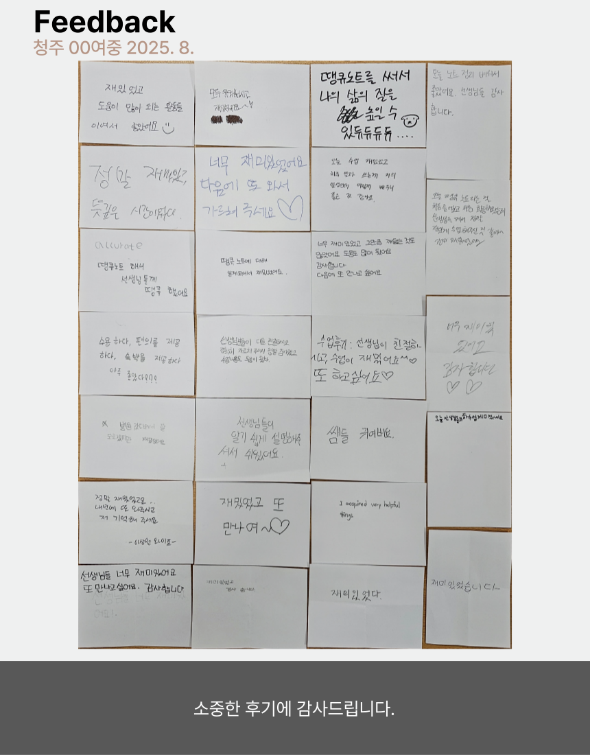 해당 수업은 집중도 높은 진행을 위해 추천 연령 이내의 학생들만 참여가 가능합니다. 추천 연령 이외의 학생이 신청했을 경우, 예고 없이 환불처리될 수 있다는 점 양해 부탁드립니다.
