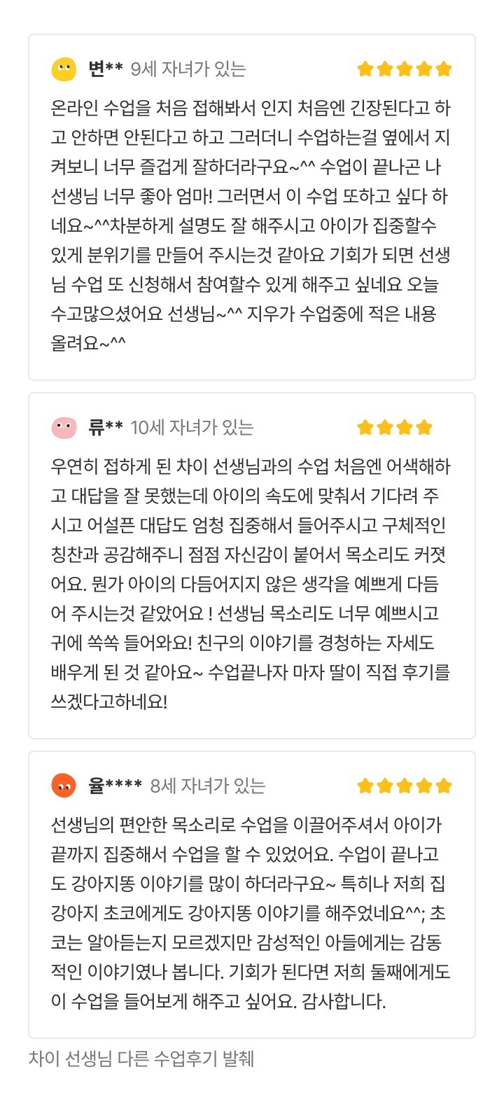 15년 강사 경력을 가진 독서, 논술, 토의토론, 한자지도사, 음악심리상담사 자격증을 보유한 친구들의 마음을 잘 읽고, 소통할 수 있는 따뜻한 선생님입니다. 칭찬, 공감, 기다림, 인정, 존중으로 친구들과 함께 수업합니다!!^^ 숙명여대 인적자원개발학과 인재개발학(석사 졸업) 전공자로, 사람과 우리 사회의 미래를 변화, 발전시키는 것에 교육이 얼마나 중요한 역할을 하고, 가치를 지녔는지 아는 선생님입니다. 현재 여러 강의를 진행하고 있고, "차이쌤 독서논술" 학원을 운영중이며~ 어린이 친구들과는 특히 독서, 논술, 토의토론, 어린이 힐링뮤직테라피, 인성교육, 다문화교육 등의 수업으로 학원 및 외부 강의로 많이 만나고 있어요. '꾸그'에서도 다양한 수업에서 우리 친구들과 함께하길 기대해요^^