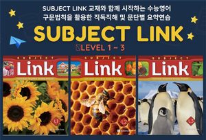 Subject Link 교재를 통해 수능영어를 대비할 수 있습니다. 주어, 동사, 목적어, 보어, 수식어 등 구문법칙을 통해 끊어서 정확한 해석을 할 수 있고 문단별 요약하기 및 주제찾기를 할 수 있습니다.