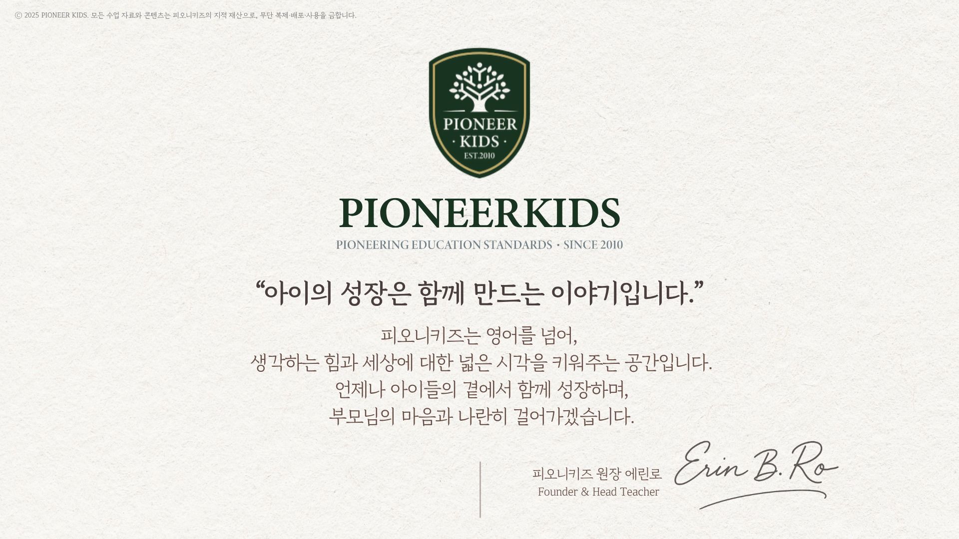 글로벌 인재로의 첫걸음, Pioneer Kids에서 시작하세요! 안녕하세요, 미국식 국제교육 전문 기관 Pioneer Kids의 원장 에린쌤 (Ms. Erin) 입니다. 한국 대치동에서 어린 시절을 보낸 후 2006년 미국 버지니아로 이주해 현지 공교육과 문화 속에서 성장하며 15년 이상 교육 현장에 몸담아왔습니다. 미국 버지니아 연방 주립대학교 (Virginia Commonwealth University)에서 생물학(Biology)과 심리학(Psychology)을 전공하고 미국 페어펙스 카운티 사립 영재 유치원을 직접 운영하며 STEAM 융합 과학 수업과 영어 영재교육 프로그램을 개발했습니다. 저는 단순한 영어 교육을 넘어 아이들이 지식·언어·탐구력을 동시에 키워 글로벌 무대에서 자신 있게 빛날 수 있도록 돕는 수업을 만듭니다. 현재 꾸그에서는 미국 현지 교육을 기반으로 한 Vocabulary Workshop 시리즈 TED-ed 똑똑한 아이를 위한 알쓸신잡 시리즈 Newbery & 명작 북클럽, etc. 폭 넓고 다양한 융합-영재형 수업들을 운영하고 있습니다. Pioneer Kids의 모든 수업은 미국 현지 수업처럼 토론과 사고 중심으로 진행되며 학생 개개인의 호기심과 잠재력을 세계로 확장시키는 것을 목표로 합니다.