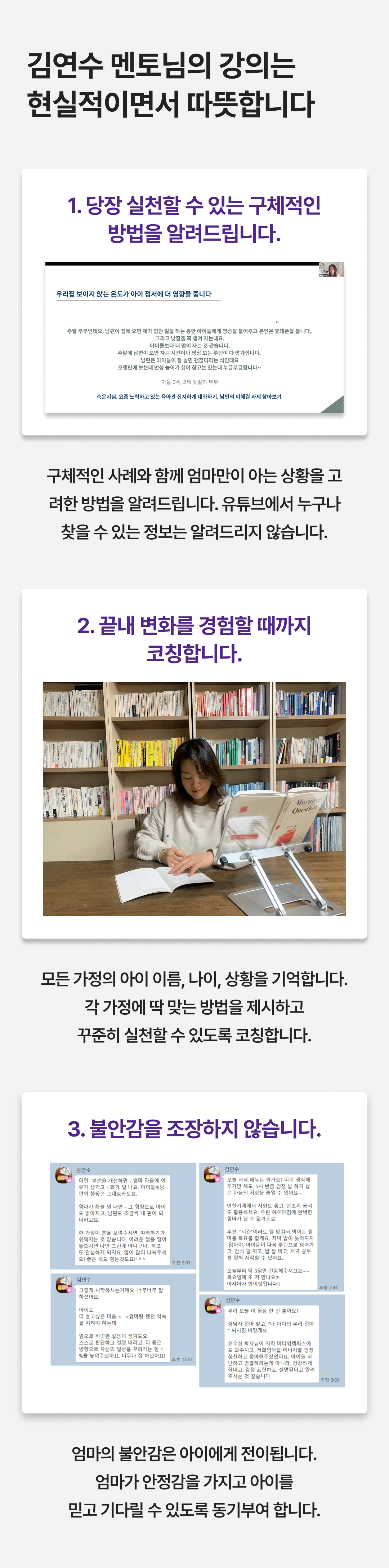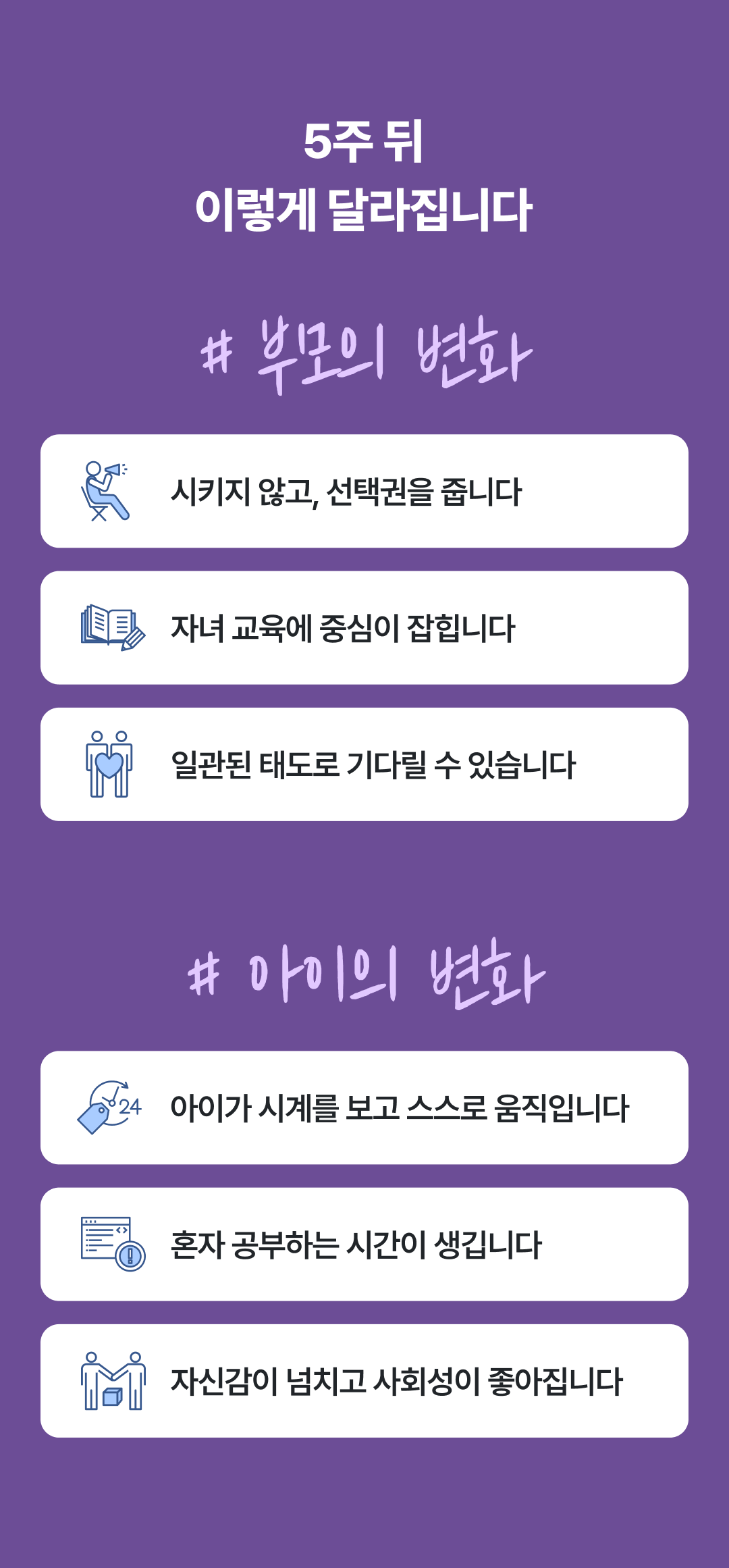 다른 가정의 상황과 피드백을 들으면서도 자녀교육의 핵심과 노하우를 배울 수 있습니다.
