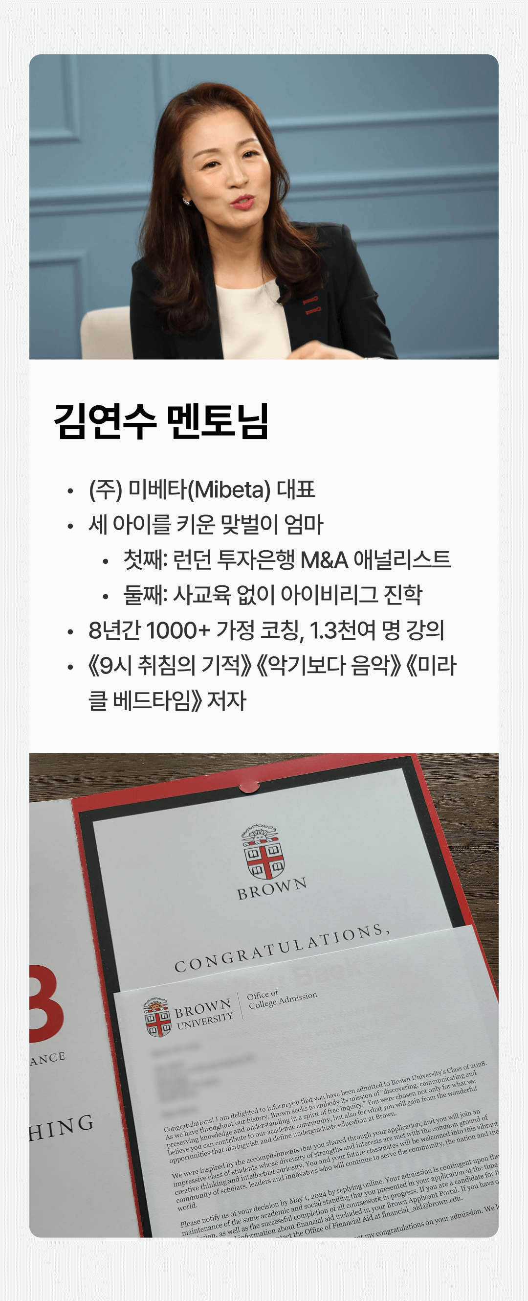 ”취침습관이 자기주도적인 아이를 만든다” 안녕하세요? 김연수 입니다😊 대학교 2학년, 고등학교 3학년, 중학교 3학년 삼남매 엄마이자 미라클 베드타임 코치입니다. 800여 가족, 1300여명의 아이들을 코칭했고 지난 6년간 온오프라인 강의로 1.2만여 명을 만났습니다. 갈수록 부모노릇 하기가 쉽지 않습니다. 늘어나는 휴대폰 사용, 불규칙적인 생활 습관, 호기심없는 학습 태도, 경제적 결핍의 부재에서 오는 태만함... 어제와 다른 오늘을 살고 싶다면, 환경을 바꿔야 합니다. 엄마의 힘으로 나, 아이, 가정의 행복을 만드는 방법을 알려드릴게요 총 3개의 수업을 런칭했습니다. - 원데이클래스 : 아이 성장 이론편 - 미라클 베드타임(미베타) : 아이 성장 3주 실전편 - 미라클 미타임(미타임) : 엄마 성장 3주 실전편 미베타는 아이 습관, 훈육, 아이와의 관계에 집중합니다. 미타임은 엄마를 중심으로 삶을 재정비합니다. 어디에서도 들어보지 못한 강의, 건강한 자극을 받는 시간으로 채워 드리겠습니다. 강의에서 뵐게요!