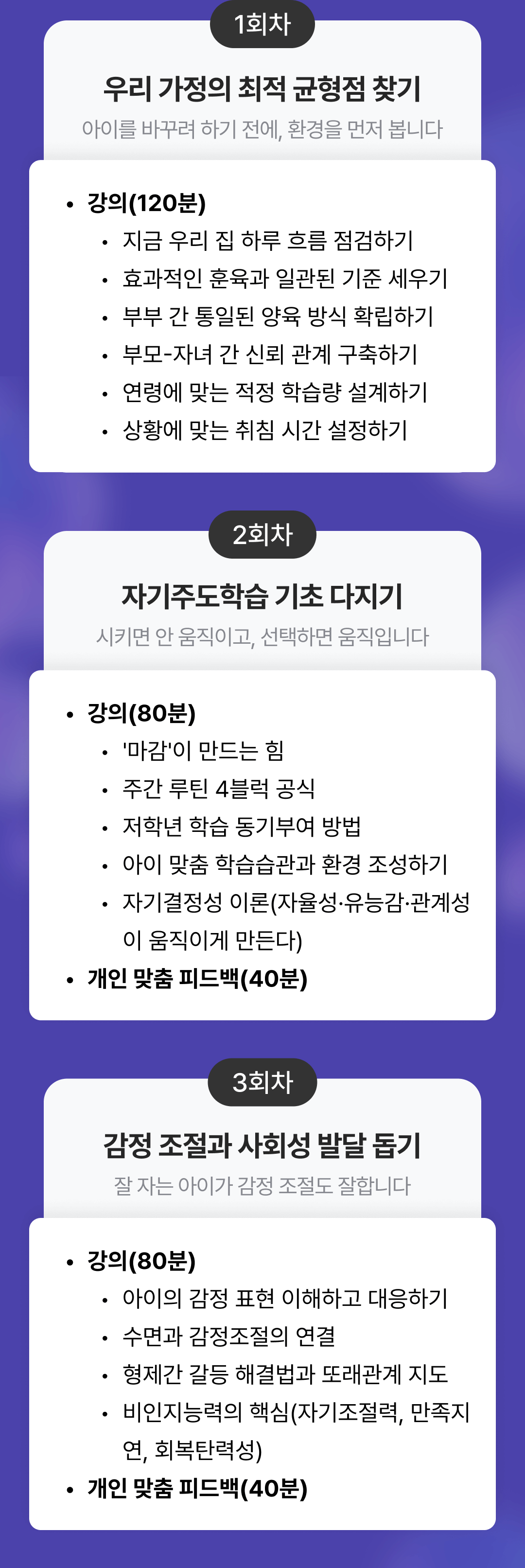 🏠 강의(80분): 아이의 감정 표현 이해하고 대응하기, 수면과 감정조절의 연결, 형제간 갈등 해결법과 또래관계 지도, 비인지능력의 핵심(자기조절력, 만족지연, 회복탄력성) 💖 개인 맞춤 피드백(40분)