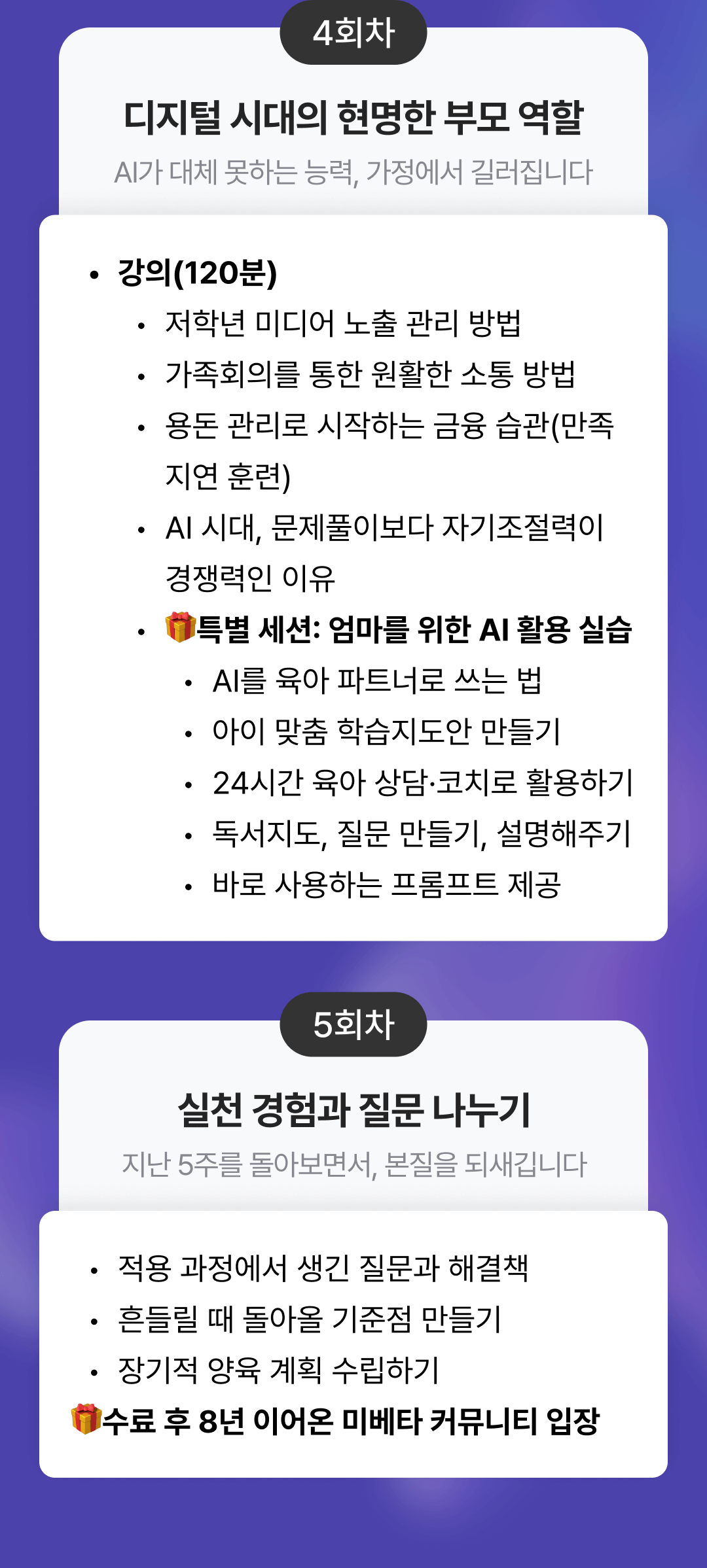 🏠 강의(120분): 저학년 미디어 노출 관리 방법, 가족회의를 통한 원활한 소통 방법, 용돈 관리로 시작하는 금융 습관(만족지연 훈련), AI 시대, 문제풀이보다 자기조절력이 경쟁력인 이유 🎁특별 세션: 엄마를 위한 AI 활용 실습, AI를 육아 파트너로 쓰는 법, 우리 아이 맞춤 학습지도안 만들기, 24시간 육아 상담사·코치로 활용하기, 독서지도, 질문 만들기, 설명해주기, 바로 쓸 수 있는 프롬프트 템플릿 제공