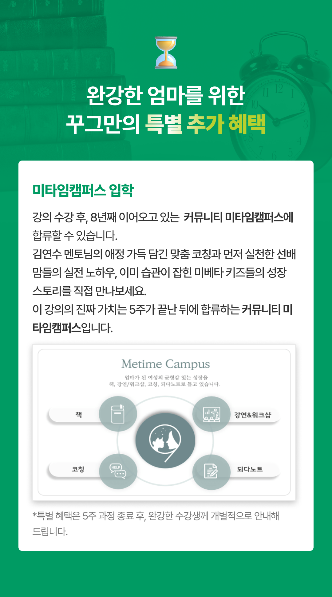 - 미타임캠퍼스 입학 조건 : 완강한 수강생 - 5회차 수업 종료 후, 완강 수강생께 입학 안내 문자를 발송해 드립니다.