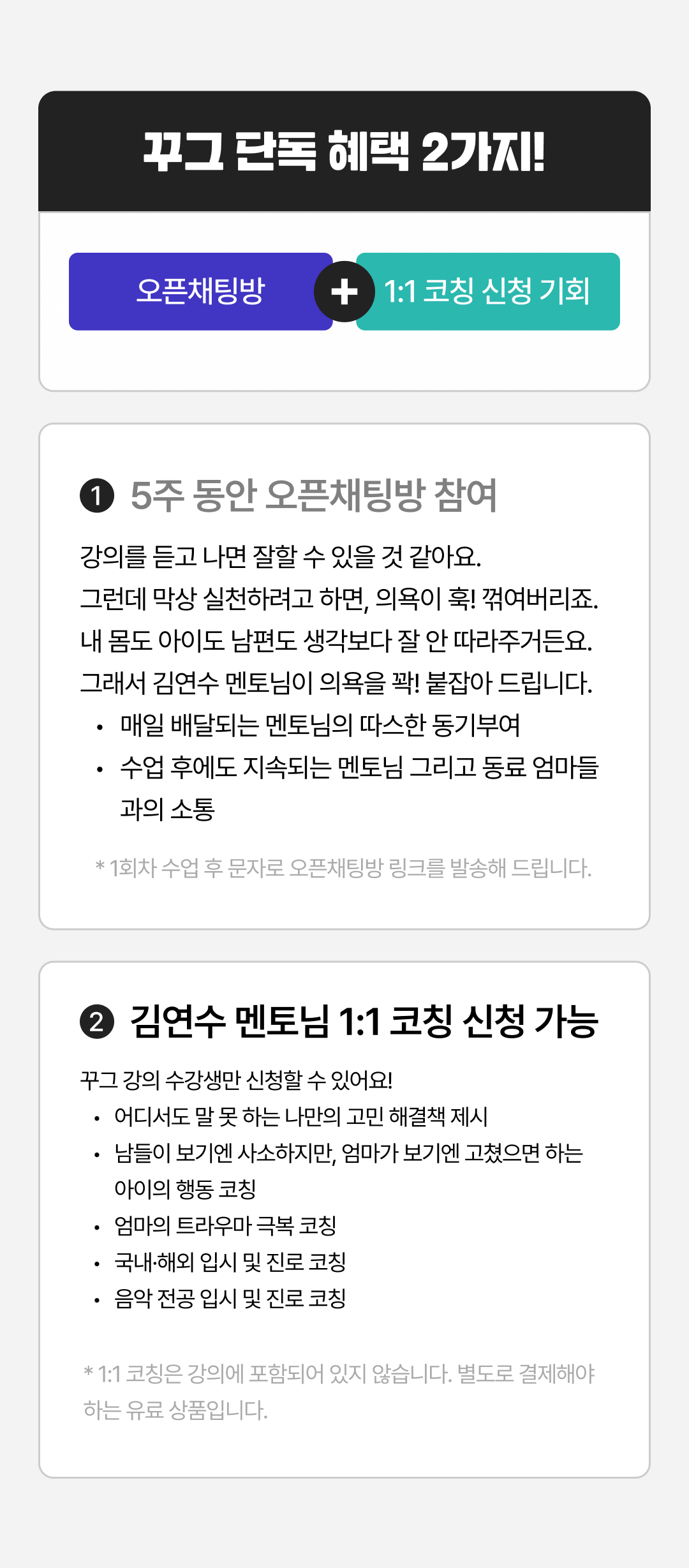 - 1:1 코칭은 별도로 결제해야 하는 유료 상품입니다. - 1:1 코칭을 받길 원하는 분만 신청하시면 됩니다. - 진행 방식 등 자세한 사항은 수업에서 안내해 드리겠습니다.