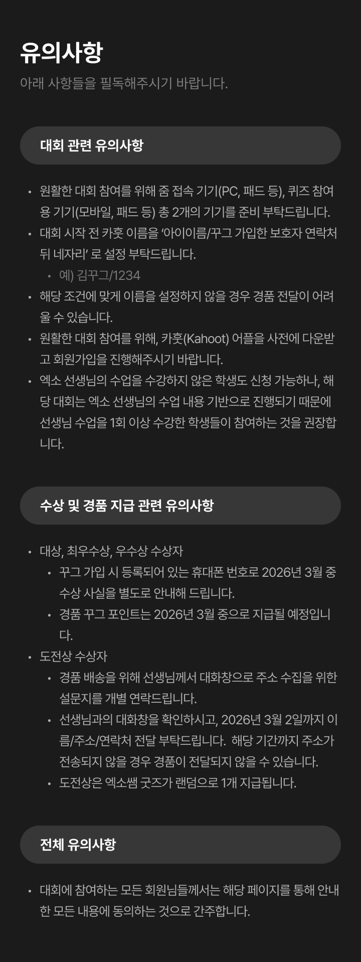 [대상, 최우수상, 우수상 수상자] 꾸그 가입 시 등록되어 있는 휴대폰 번호로 2026년 3월 중 수상 사실을 별도로 안내해 드립니다. 경품 꾸그머니는 2026년 3월 중으로 지급될 예정입니다. [도전상 수상자] 경품 배송을 위해 선생님께서 대화창으로 주소 수집을 위한 설문지를 개별 연락드립니다. 선생님과의 대화창을 확인하시고, 2026년 3월 2일까지 이름/주소/연락처 전달 부탁드립니다. 해당 기간까지 주소가 전송되지 않을 경우 경품이 전달되지 않을 수 있습니다. 도전상은 엑소쌤 굿즈가 랜덤으로 1개 지급됩니다.