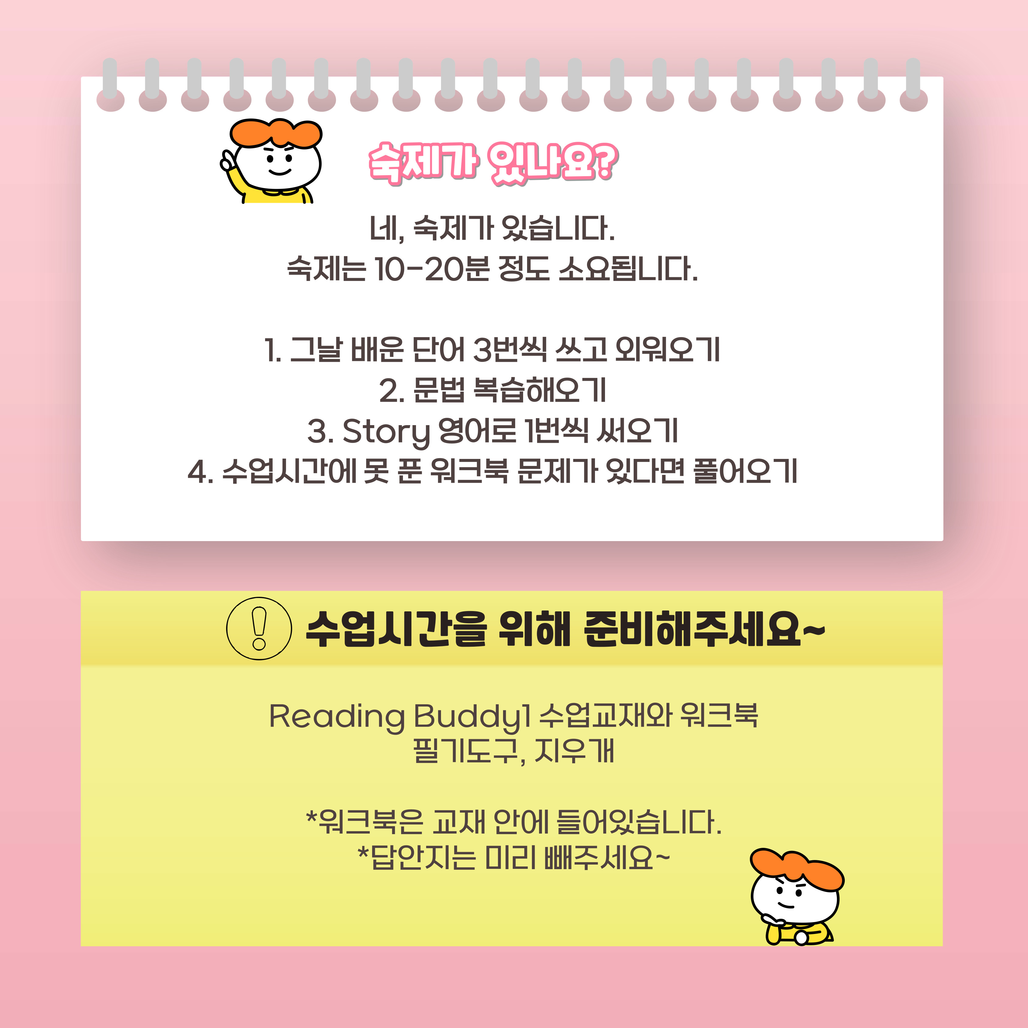 1. 대부분 숙제가 있는 편입니다. 숙제를 하기 어려운 상황이라면 사전에 말씀해주세요. 2. 수업이 시작되기 전에 교재를 미리 구매해서 준비해주세요. 3.9회차, 18회차에는 전달드리는 파일을 미리 프린트해주세요. 일주일 전쯤 한번 더 안내드릴 예정입니다.