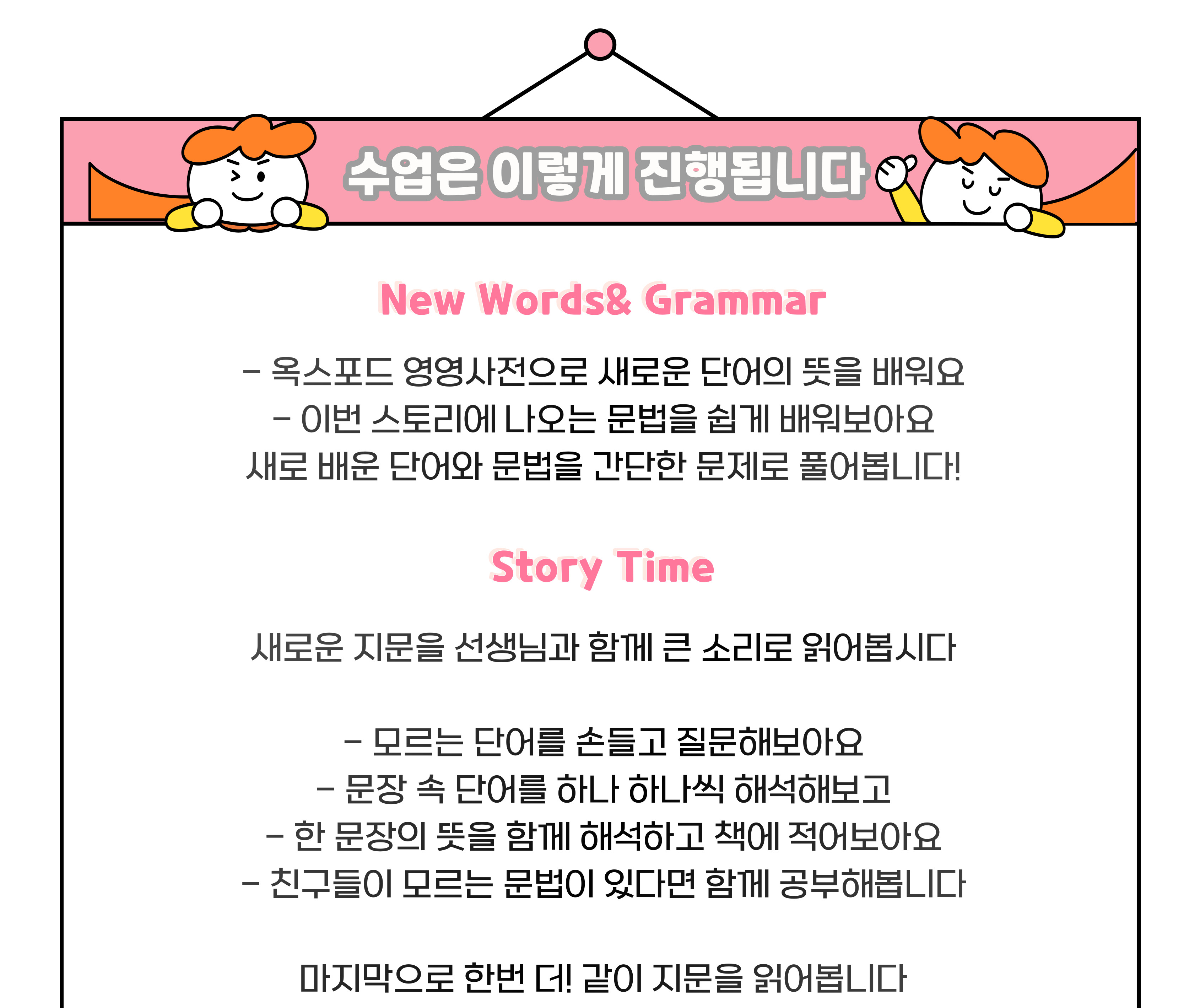 알파벳을 다 익히지 않았거나 4글자 이상의 영어단어를 읽을 줄 모른다면 수업 이해에 어려움이 있을 것 같아요