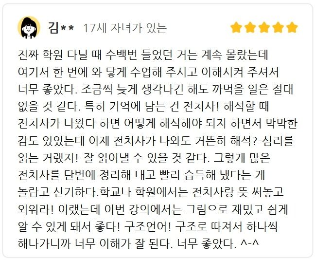 영어와 바둑을 수업하는 빛나리쌤입니다. 영어는 20년 전부터 지금까지 쭈욱 가르쳐오고 있습니다. 바둑은 쌤의 자녀들을 가르치다가 "나는야 바둑왕"이라는 탁월한 AI전자교재를 발견하여 꾸그를 통해 온라인으로 가르치게 되었습니다. 영어는 문장구조를 파악하여 독해를 쉽고 정확하고 빠르게 할 수 있도록 돕습니다. 그리고 암기하지 않고 이해하는 문법, 어원으로 이해하는 어휘학습, 구조로 쉽고 재미있게 배우는 영작을 수업합니다. 먼저 레벨 테스트로 문법, 어휘, 독해, 듣기 영역의 학습진단을 하고 학습처방과 함께 학생에게 필요한 수업을 추천해 드립니다. "AI와 함께 하는 나는야 바둑왕"수업은 인공지능 전자바둑교재 "나는야바둑왕"으로 학생들이 바둑을 쉽고 재미있고 빠르게 배울 수 있도록 도와드립니다.. 바둑은 어른들만의 게임이라고 생각하는 학생, 막연히 바둑은 어렵고 지루할 거라고 생각하는 학생들이 있다면 이번 수업으로 그 생각을 완전히 바꾸게 될 겁니다.. 인공지능 전자바둑교재 "나는야 바둑왕"은 마치 게임을 하듯 쉽고 재미있게 바둑을 배울 수 있습니다. 바둑은 한 수 한 수 둘 때마다 깊이 생각해야 하기 때문에 생각하는 힘을 길러줄 수 있습니다. 그리고 바둑을 두다 보면 한두 시간이 금방 지나갈 정도로 집중하는 힘도 좋아집니다. "나는야 바둑왕"으로 쉽고 재미있게 바둑을 배워서 바둑 실력과 함께 생각하는 힘과 집중하는 힘을 길러보세요. 저에게는 네 명의 자녀가 있는데 제가 직접 영어를 가르치고 바둑까지 가르쳤습니다. 그 덕분인지 첫째는 인천하늘고등학교(자사고)를 거쳐 연세대 컴퓨터과학과에 진학했고 둘째와 셋째도 하늘고에 재학중입니다. 빛나리쌤과 함께 바둑으로 집중력도 기르고 영어도 공부해 봐요.