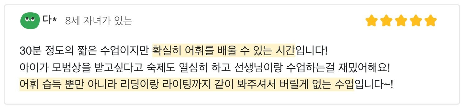 재미와 성취감을 느끼는 학습 경험으로 바뀝니다.영작 실력이 눈에 띄게 향상되며, 스스로 문장을 만드는 자신감이 생깁니다.